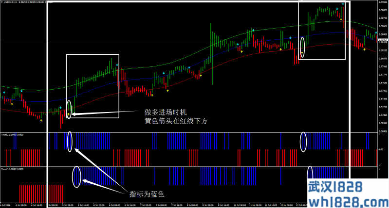 1. 做多时机:在蓝线或者红线下方出现黄色箭头,下方趋势方向指标为蓝色。
