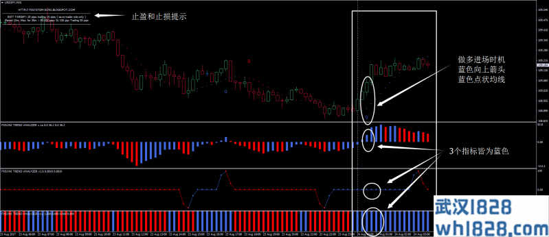 1. 做多时机:3个趋势分析指标皆为蓝色;蓝色向上箭头;修改型均线指标为蓝色。