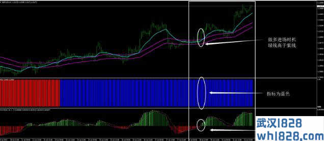 1. 做多时机:绿色EMA均线高于两条紫色均线;过滤器指标(filter)为蓝色;MACD指标双线高于零线,动能柱为绿色。
