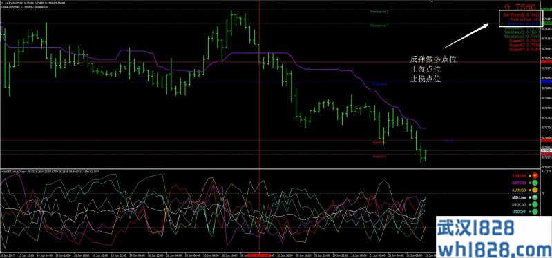 2. 做空时机:K线低于紫色移动均线;价格触及卖出价(Sell Price)提示的进场点位;JOGET多货币对提示指标显示该货币对为红色向下箭头。