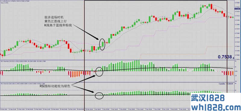 1.做多时机:K线蜡烛图同时高于多时间框架江恩线组合(Gann Hi lo Activator)中的蓝线和粉线;两个RSI复合型动态柱提示指标都为绿色。