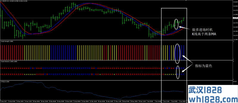 1. 做多时机:K线高于两条均线;趋势动能指标为蓝色;趋势方向指标为蓝色向上箭头。