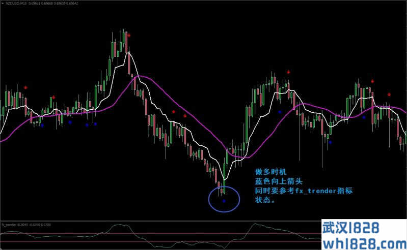 1. 做多时机:蓝色向上箭头;同时要参考fx_trender指标状态。
