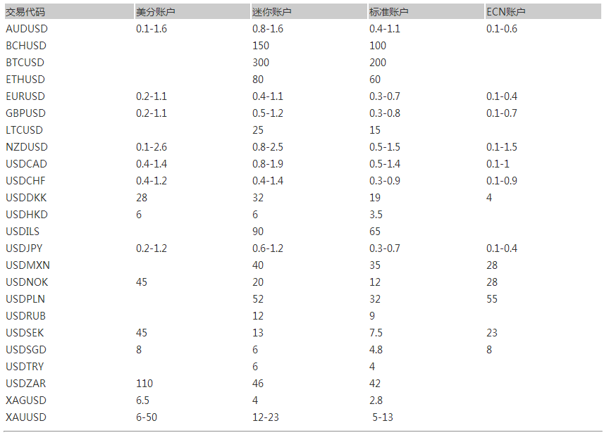 EXNESS外汇交易点差表: