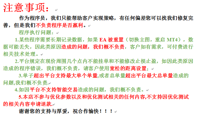 【店主介绍】店主多年MQ4编程经验,针对EA/指标编程定制修改服务,编程手法细腻,参数设置合理,能贴近客户需求。【交易流程】先写好策略思路,发我旺旺--->定好价格--->拍下相应数量的宝贝--->付款到定单上--->讨论细节--->我写好交货EX4--->请确认收货并好评,我们再给您正式源码程序--->后期若需要修改的话,看难易程度,不一定免费(约定条件内,程序自身BUG终身免费修正。新增条件、逻辑改变,合理收费,且不是所有要求都能实现,不能实现的部分将会在编写前告知!)。【服务费用】看难易程度收费 (10 - ???)元,网页上10元不是最终的价格,谈好价格再拍下相应数量的宝贝。【开发时间】1-7天交货,100%实现客户需求。【程序交付】本宝贝一旦拍下,不退款,因为反复沟通和协商是需要付出脑力劳动的,请注意!程序完成后,给您试用版或演示程序效果,您依需求验收。不符合请及时反馈我们修改,若符合需求,请确认收货并好评,我们再给您正式源码程序,交易完成。【售后服务】约定条件内,如“Bug修复、删除条件”,终身免费修正。非约定条件,如“新增细节、改变细节”,合理收费。(价格不等,看具体难度及工作量。不保证任何新增条件都能实现,不能实现的内容,会提前告知您)。还望理解。【源码承诺】本店全体客户全新定制的策略EA都会免费给予源码,有了源码,以后有什么需要修改或升级的地方都可以用到,特别是自己加密,或加上时间限制之类的更是需要源码,本店想你所想,价格公道!客户的认可是我们前行的动力和奋斗的宗旨,我们的目标是,尽己所能,让您花最小的代价和时间,获得最满意的回报!!