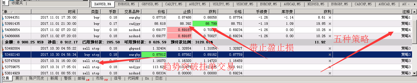 EA采用挂单和市价单成交的方式交易,先在前高前低的关建位置挂单,原当行情往一个方向,快速有力突破前高或前低关键位时,触发挂单,行情如果快速突破关键位时会连续平倍加仓,没有马丁,单单带止损。