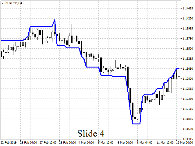 In addition to the main monowave line, this indicator has track lines. At the first start of the indicator, they are not visible. But they can be turned on (visualized) by specifying for them a color other than transparent, for example, blue. After they are turned on, the indicator will look like shown in slide 3 .