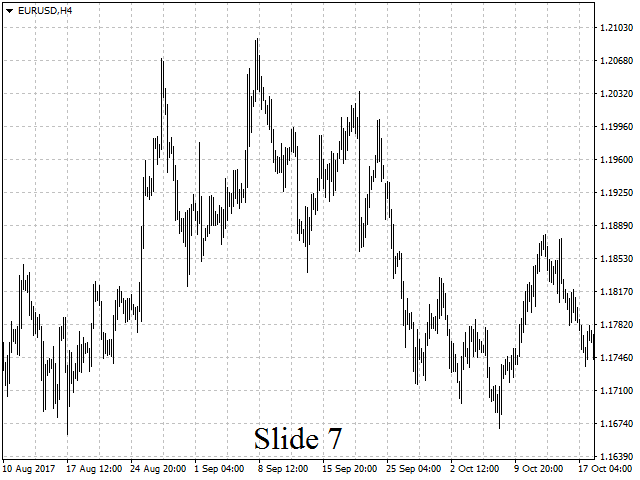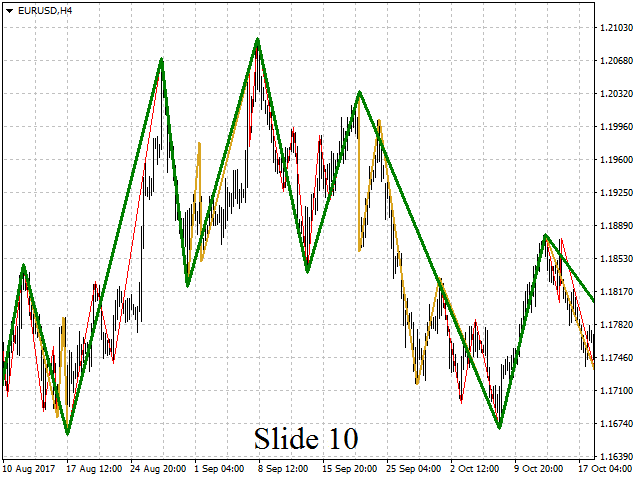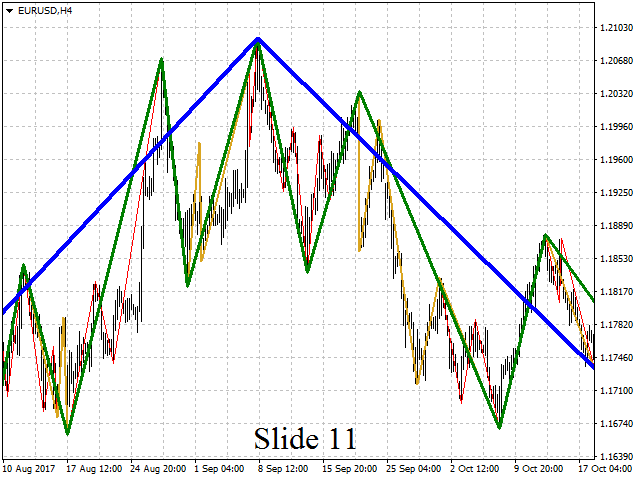 Why are these lines needed? There are at least three reasons to see them on the chart. First , these lines show the trajectory along which the right end of the mono-wave line segment moves in the process of its formation (as new bars appear). In fact, the lines of the track - this is the real mono-wave line. This is especially evident if you turn off the display of the main mono-wave line (by switching its color to transparent), while leaving only the display of the lines of the track. See slide 4 .