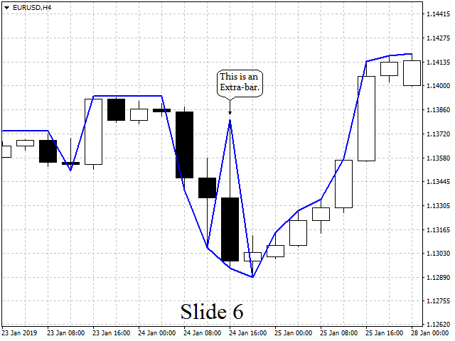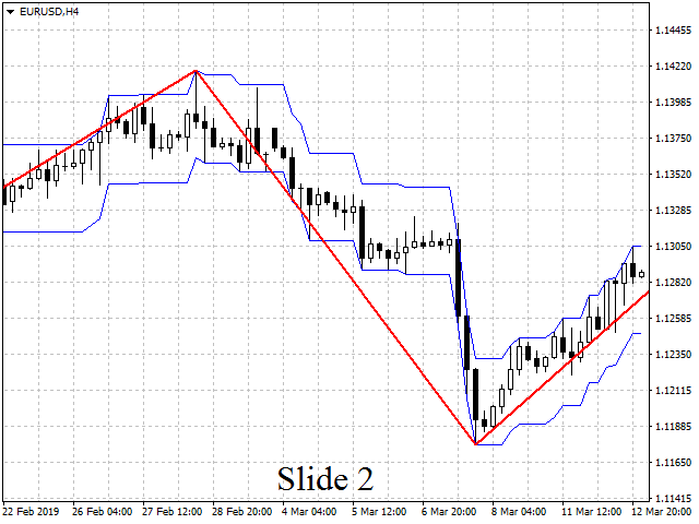 Secondly , the track lines show the moments at which a mono-wave line breaks, i.e. the construction of the previous segment is stopped and the construction of a new (oppositely directed) segment begins. To see this better, add the PPPC indicator price line display to the track lines. See slide 5 . On this slide, the lines (i.e. borders) of the price channel are shown by thin blue lines, and the lines of the track by thick blue lines. As you can see on this slide, the lines of the track always move along one of the boundaries of the channel (either upper or lower). Sometimes track lines jump from one channel boundary to another. So, at the moment of such jumping, the mono-wave line breaks: i.e. the construction of the previous segment stops and the construction of a new (oppositely directed) segment begins. For example, when the track lines jump from the lower to the upper boundary of the channel, the construction of the previous (downward) segment of the mono-wave line stops, and the construction of a new segment upward begins.