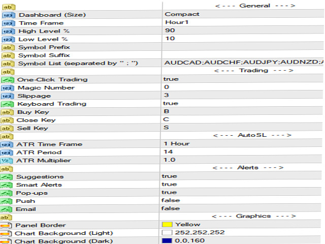 THIS DASHBOARD WILL NOT AUTOMATICLY TRADE FOR YOU This Dashboard is designed to help the manual trader look at the entire market and check the volatility of each pair. This Indicator / EA Utility is best used on Time frame H1 to H4