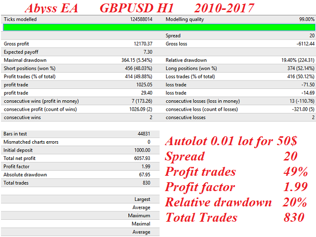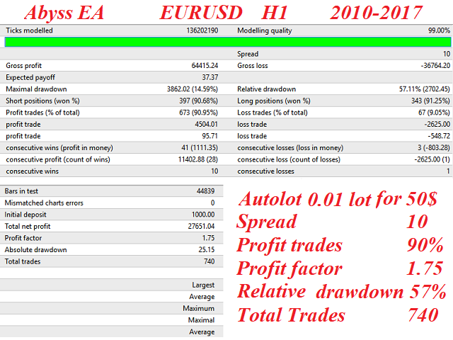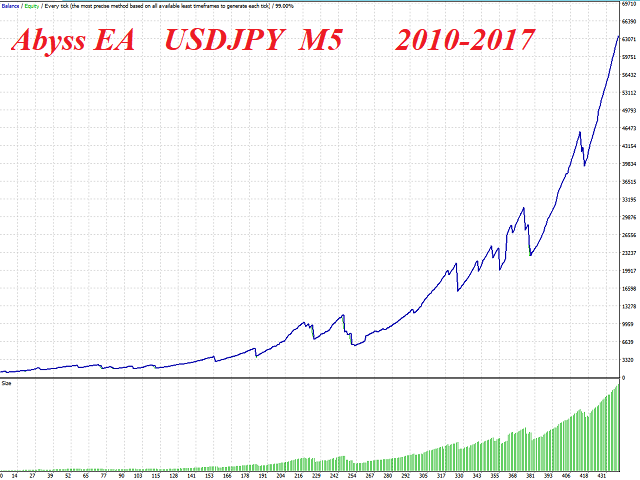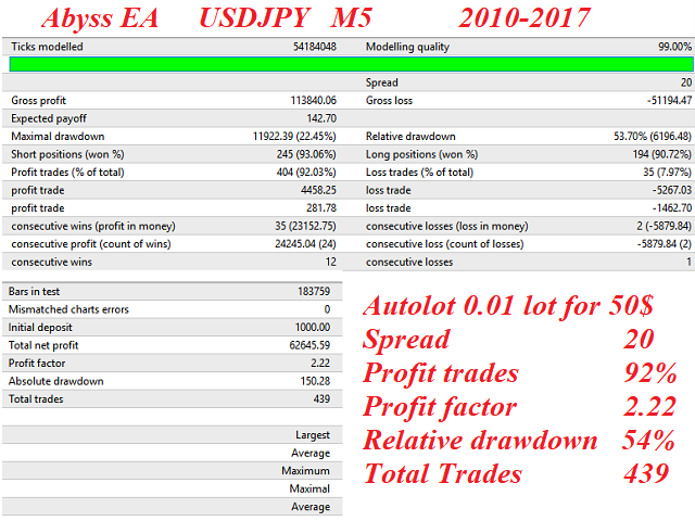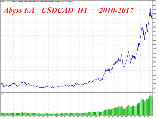 Abyss EA is a long-term Expert Advisor using the breakthrough of price levels in its algorithm. The EA sets the buy stop and sell stop orders at certain levels. All trades are accompanied by stop losses exceeding the expected profit several times. Profitable trades are accompanied by a trailing stop triggered when the order reaches a certain profit. All trades are closed on the selected day of week, so there is no sitting out the losses. You are also able to use the auto lot.