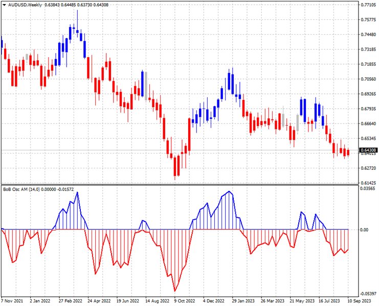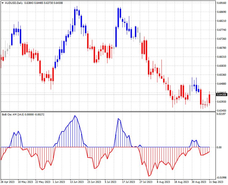 This indicator displays in the form of an oscillator the difference between the maximum/minimum prices for the current period of time and the maximum/minimum price for a longer period.