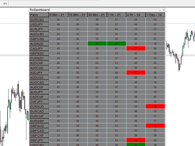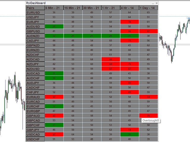 Never miss when a pair is being oversold or overbought again!! This RSI dashboard allows you to monitor RSI levels on 6 different time frames for up to 30 different currency pairs.