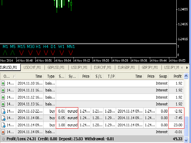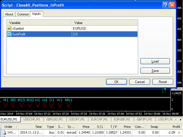 The script allows you to close all opened positions for a given currency pair ( EURUSD by default, but it can be changed to any existing currency pair) when Sum of Profit from all opened positions (by chosen currency pair) is equal or greater than value of the input parameter: SumProfit .