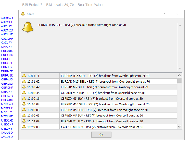 For every alert you can add comments: "Breakout From Oversold Comment" (default: "BUY") and "Breakout From Overbought Comment" (default: "SELL"), which are embedded between timeframe and RSI period. Information received in the alerts are: symbol, timeframe, comment, RSI (with given period) breakout from Oversold/Overbought zone at RSI level, eg.: EURUSD M15 BUY - RSI (14) breakout from Oversold zone at 30.