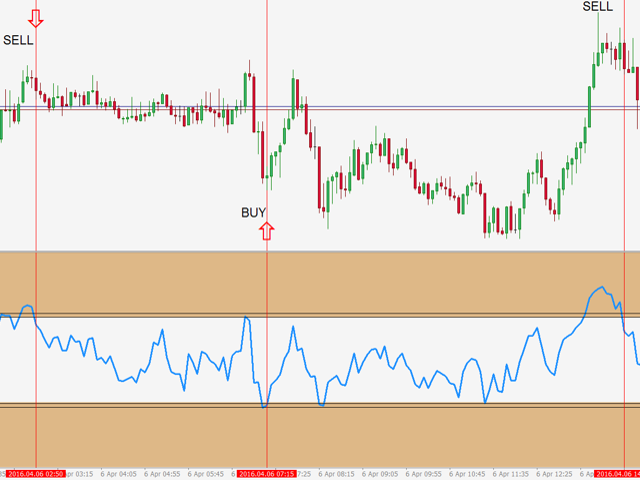 In case of overbought it's similar, but inverted - the price goes down and crosses the hysteresis zone back to the neutral zone and gives SELL.