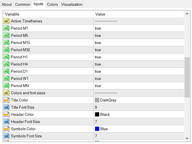 All displayed and used by indicator symbols are free to choose and are specified using a space separated list in parameters, so you're able to analyze not only predetermined ones, but everything that your broker offers, also commodities, equities, indices, ones with prefixes, suffixes etc.