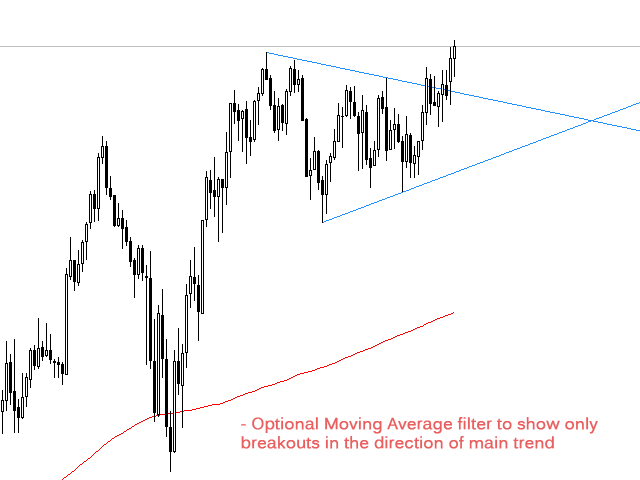 - Optional Moving Average filter to signal breakouts only in the direction of the main trend.