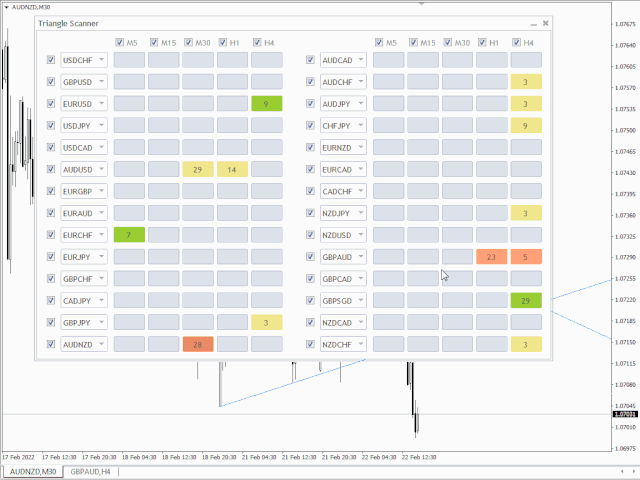- Showing the number of bars passed since the triangle pattern formed, on dashboard buttons.