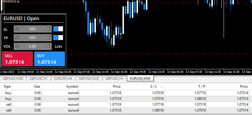 Input Fields: Allows trader input for trade parameters. (Volume, SL and TP Points)