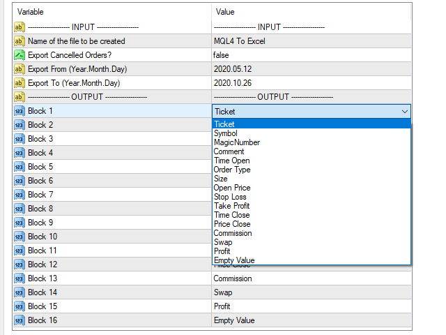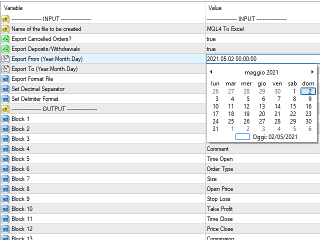 Export From / Export To - Set the period of trade you want to export (from date do date);