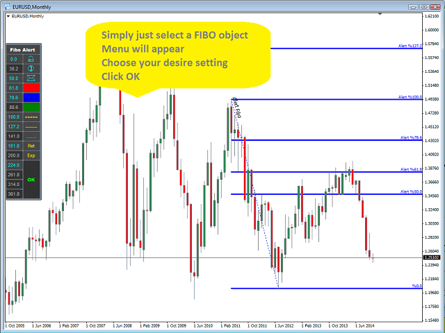 This tool adds alerts to your Fibo Retracement and Fibo Expansion objects on the chart. It also features a handy menu to change Fibo settings easily and quickly!