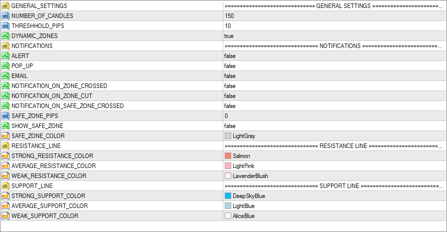 To run the indicatior you need to set two main parameters. The first is the number of candles to be analyzed by the program. The second is the value calculated in pips, which is the error threshold of the found zone what in practice means the width of the zone.