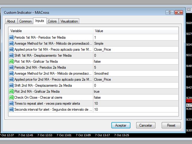 This is a simple but functional Moving Average Cross Alert, just set the parameters for both moving averages and when they cross or are equal you will get an alert. If you configure your terminal to send emails or notifications, the indicator will send you an alert by mail or notification.