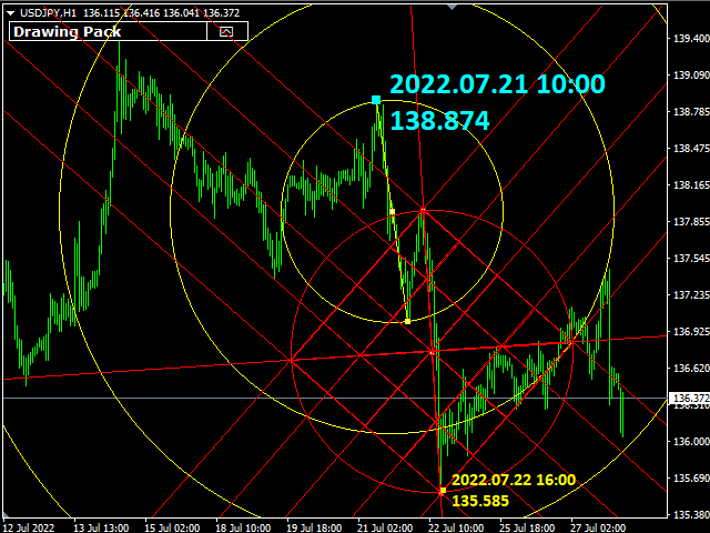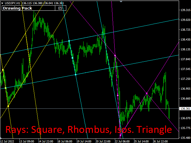 The drawings will keep their proportions (according to their handle trendline) across different chart scales, update in real time, and multiple drawings are supported.