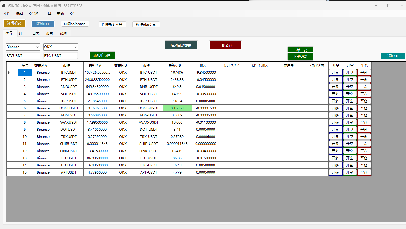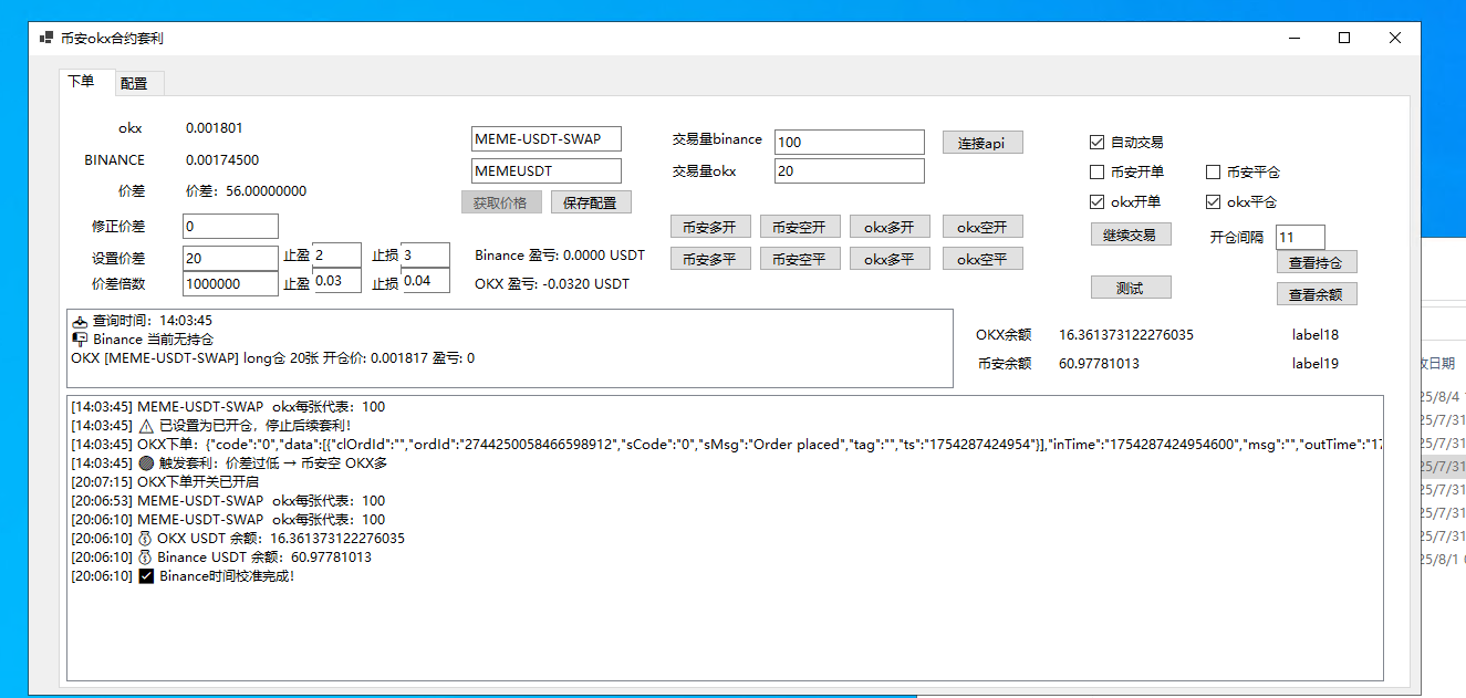 操作按钮:包括“启动自动交易”、“一键套利”、“下单币安”、“下单OKX”等,操作简便。