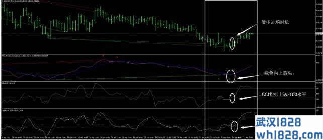 1.做多时机:MACD背离指标出现绿色向上箭头;CCI顺势指标上破-100水平位;KDJ随机指标上行(最佳情况为从超卖区反转上升,20水平位上破)。